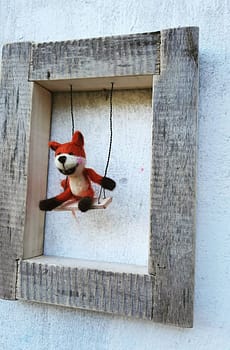 Lisica na gugalnici je obešanka za na steno. Kombinacija starega lesu in vilcanih figuric.